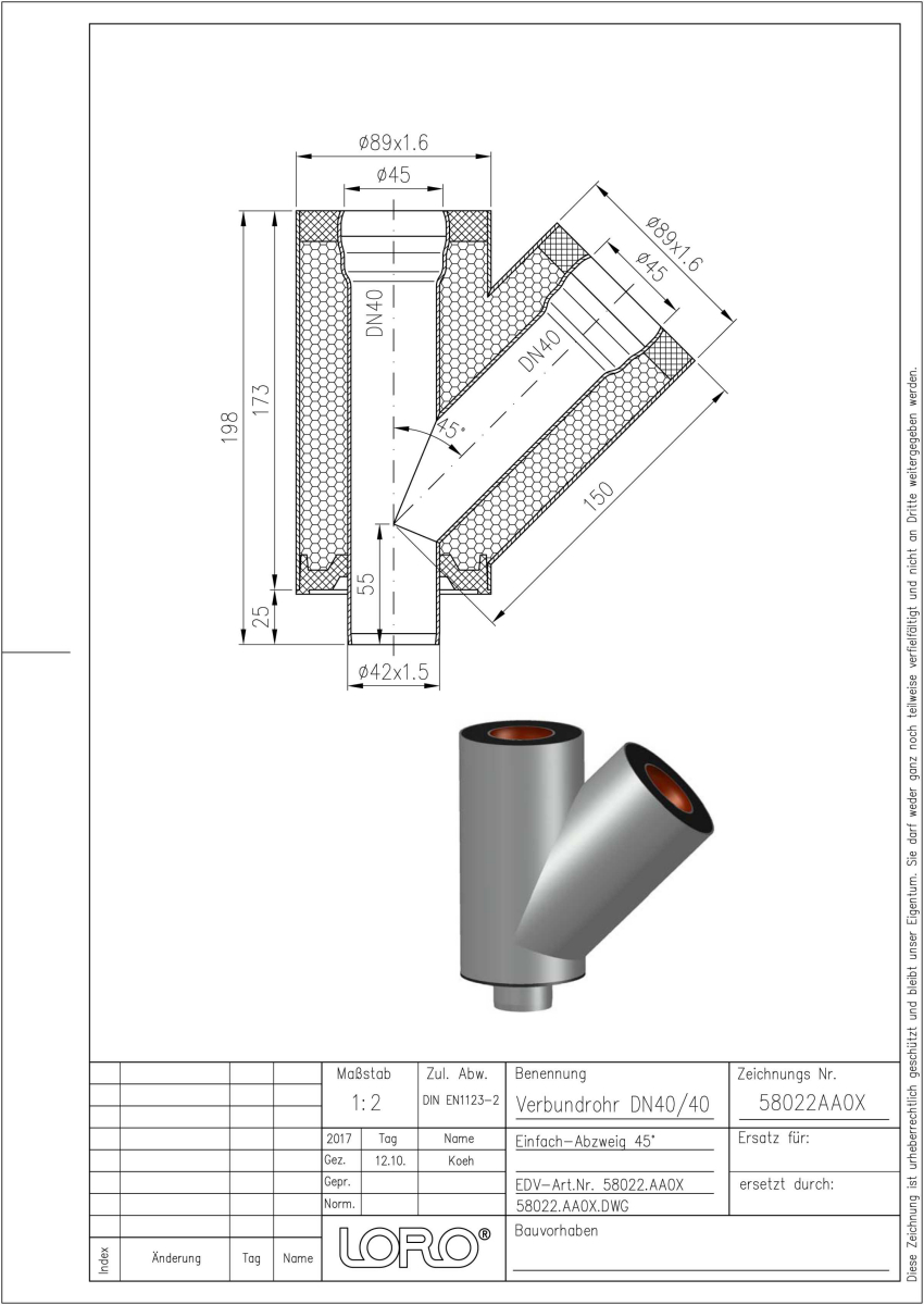 LORO-X Verbundrohr-Abzweig, bestehend aus Innenrohr (LORO-X Rohr, aus Stahl feuerverzinkt, nach DIN EN 1123, mit erhöhtem Qualitätsstandard gemäß RAL-Gütezeichen GZ-694, mit 2-Kammern-Steckmuffenverbindung, Baustoffklasse A1, formstabil, bruchfest, rückstausicher, langlebige Innenbeschichtung gemäß DIN EN ISO 2178 auf Basis einer 2K-Epoxid-Kombination, Farbton: Rotbraun), Dämmschicht (PU-Hartschaum B2, FCKW-frei) und Außenrohr (LORO-X Rohr, aus Stahl, feuerverzinkt), 45 Grad, DN 40