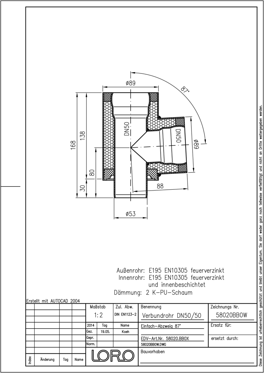 LORO-X Verbundrohr-Abzweig, bestehend aus Innenrohr (LORO-X Rohr, aus Stahl feuerverzinkt, nach DIN EN 1123, mit erhöhtem Qualitätsstandard gemäß RAL-Gütezeichen GZ-694, mit 2-Kammern-Steckmuffenverbindung, Baustoffklasse A1, formstabil, bruchfest, rückstausicher, langlebige Innenbeschichtung gemäß DIN EN ISO 2178 auf Basis einer 2K-Epoxid-Kombination, Farbton: Rotbraun), Dämmschicht (PU-Hartschaum B2, FCKW-frei) und Außenrohr (LORO-X Rohr, aus Stahl, feuerverzinkt), 87 Grad, DN 50