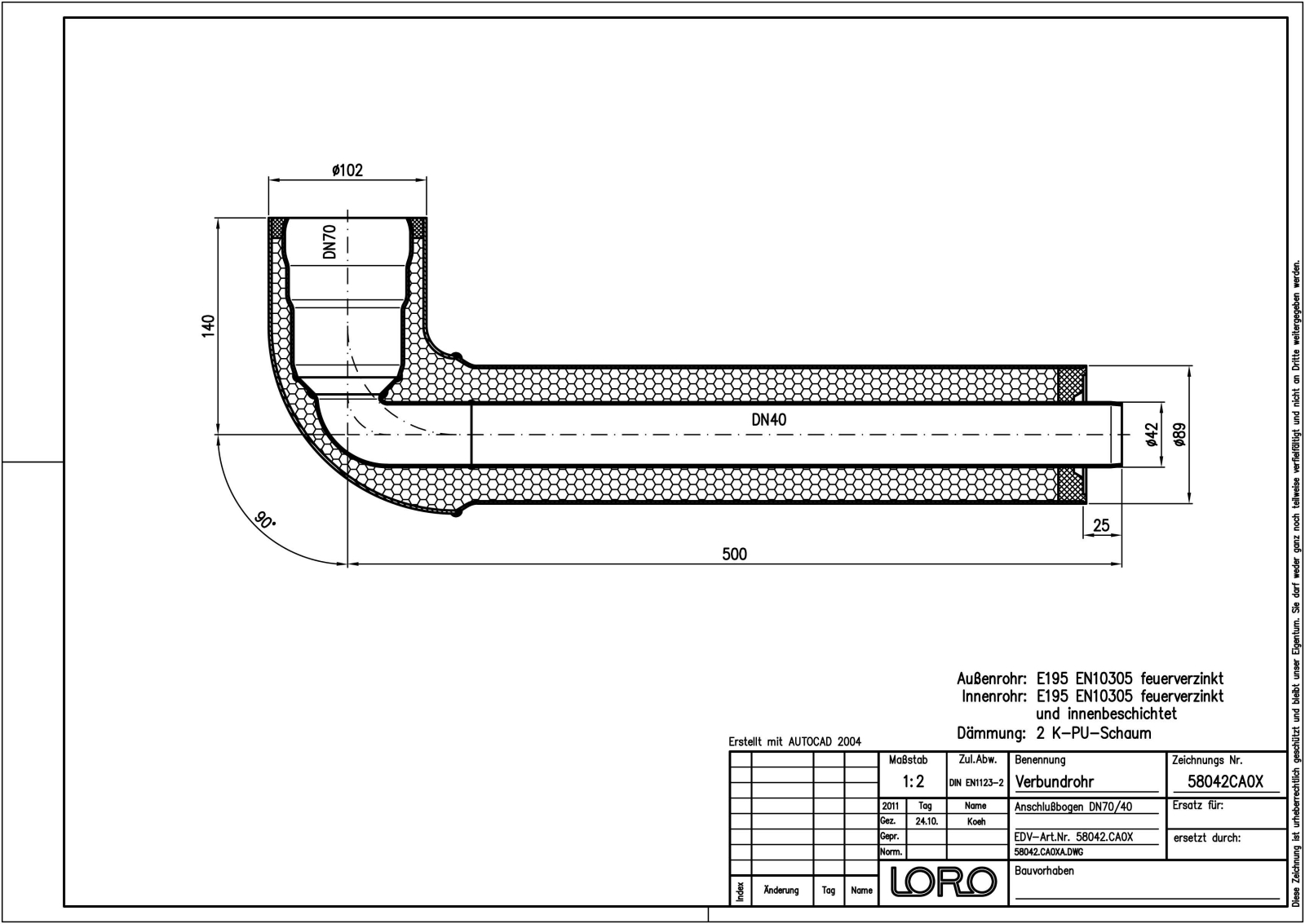 LORO-DRAINJET Verbundrohr-Anschlussbogen, bestehend aus Innenrohr (LORO-X Rohr, aus Stahl, feuerverzinkt, nach DIN EN 1123, mit erhöhtem Qualitätsstandard gemäß RAL-Gütezeichen GZ-694, mit 2-Kammern-Steckmuffenverbindung, Baustoffklasse A1, formstabil, bruchfest, rückstausicher, langlebige Innenbeschichtung gemäß DIN EN ISO 2178 auf Basis einer 2K-Epoxid-Kombination, Farbton: Rotbraun), Dämmschicht (PU-Hartschaum B2, FCKW-frei) und Außenrohr (LORO-X Rohr, feuerverzinkt), 90 Grad, DN 70/40