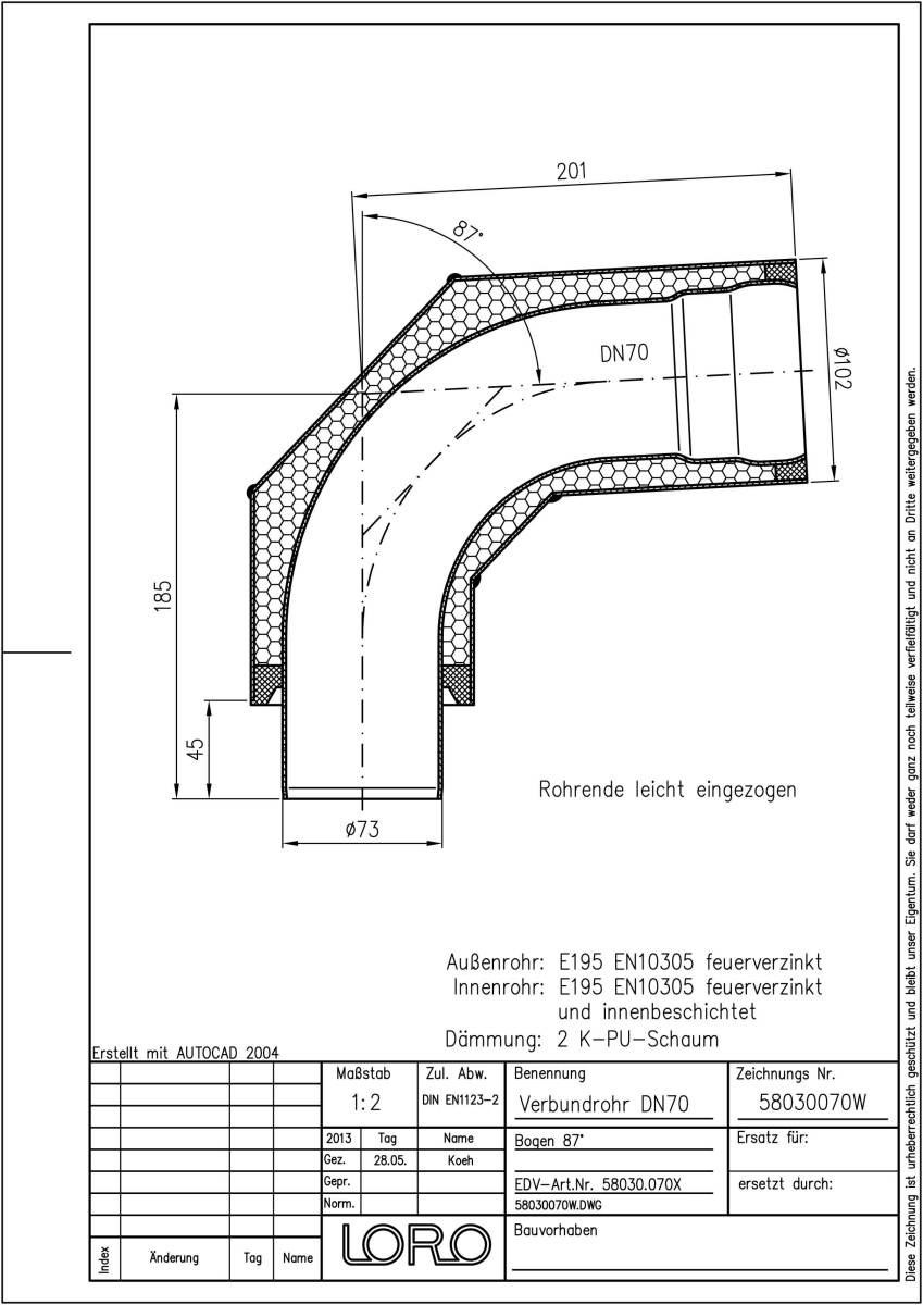 LORO-X Verbundrohr-Bogen, bestehend aus Innenrohr (LORO-X Rohr, aus Stahl, feuerverzinkt, nach DIN EN 1123, mit erhöhtem Qualitätsstandard gemäß RAL-Gütezeichen GZ-694, mit 2-Kammern-Steckmuffenverbindung, Baustoffklasse A1, formstabil, bruchfest, rückstausicher, langlebige Innenbeschichtung gemäß DIN EN ISO 2178 auf Basis einer 2K-Epoxid-Kombination, Farbton: Rotbraun), Dämmschicht (PU-Hartschaum B2, FCKW-frei) und Außenrohr (LORO-X Rohr, feuerverzinkt), 87 Grad, DN 70