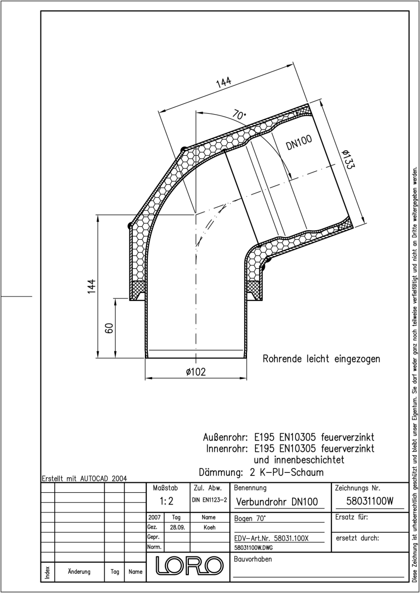 LORO-X Verbundrohr-Bogen, bestehend aus Innenrohr (LORO-X Rohr, aus Stahl, feuerverzinkt, nach DIN EN 1123, mit erhöhtem Qualitätsstandard gemäß RAL-Gütezeichen GZ-694, mit 2-Kammern-Steckmuffenverbindung, Baustoffklasse A1, formstabil, bruchfest, rückstausicher, langlebige Innenbeschichtung gemäß DIN EN ISO 2178 auf Basis einer 2K-Epoxid-Kombination, Farbton: Rotbraun), Dämmschicht (PU-Hartschaum B2, FCKW-frei) und Außenrohr (LORO-X Rohr, feuerverzinkt), 70 Grad, DN 100