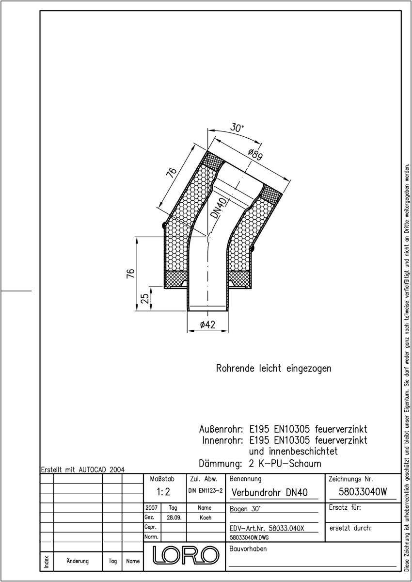 LORO-X Verbundrohr-Bogen, bestehend aus Innenrohr (LORO-X Rohr, aus Stahl, feuerverzinkt, nach DIN EN 1123, mit erhöhtem Qualitätsstandard gemäß RAL-Gütezeichen GZ-694, mit 2-Kammern-Steckmuffenverbindung, Baustoffklasse A1, formstabil, bruchfest, rückstausicher, langlebige Innenbeschichtung gemäß DIN EN ISO 2178 auf Basis einer 2K-Epoxid-Kombination, Farbton: Rotbraun), Dämmschicht (PU-Hartschaum B2, FCKW-frei) und Außenrohr (LORO-X Rohr, feuerverzinkt), 30 Grad, DN 40