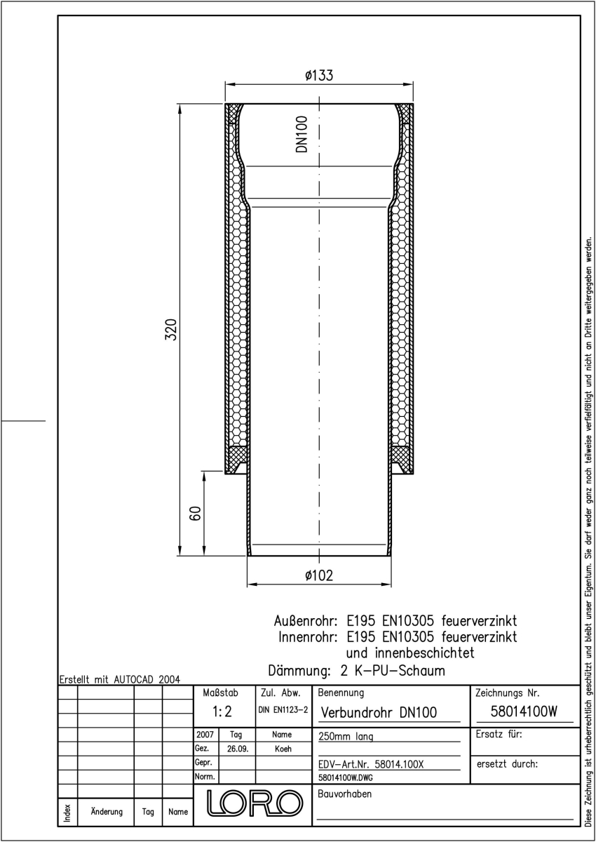 LORO-X Verbundrohr bestehend aus Innenrohr (LORO-X Rohr, aus Stahl feuerverzinkt, nach DIN EN 1123, mit erhöhtem Qualitätsstandard gemäß RAL-Gütezeichen GZ-694, mit 2-Kammern-Steckmuffenverbindung, Baustoffklasse A1, formstabil, bruchfest, rückstausicher, langlebige Innenbeschichtung gemäß DIN EN ISO 2178 auf Basis einer 2K-Epoxid-Kombination, Farbton: Rotbraun), Dämmschicht (PU-Hartschaum B2, FCKW-frei) und Außenrohr (LORO-X Rohr, aus Stahl, feuerverzinkt), 250 mm lang, DN 100