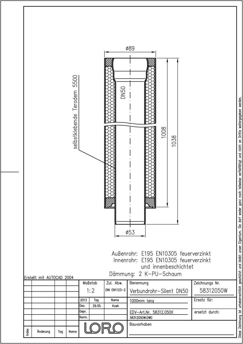 LORO-X Verbundrohr, Ausführung SILENT, für erhöhte Schalldämmung, bestehend aus: Innenrohr (LORO-X Rohr, aus Stahl, feuerverzinkt, nach DIN EN 1123, mit erhöhtem Qualitätsstandard gemäß RAL-Gütezeichen GZ-694, mit 2-Kammern-Steckmuffenverbindung, Baustoffklasse A1, formstabil, bruchfest, rückstausicher, langlebige Innenbeschichtung gemäß DIN EN ISO 2178 auf Basis einer 2K-Epoxid-Kombination, Farbton: Rotbraun), Schallschutzmatte (am Innenrohr angebracht), Dämmschicht (PU-Hartschaum B2, FCKW-frei) und Außenrohr (LORO-X Rohr, feuerverzinkt) 1000 mm lang, DN 50