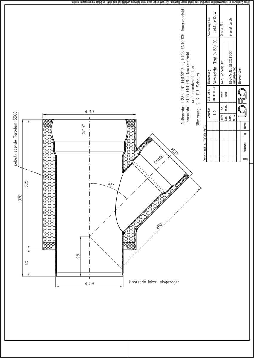 LORO-X Verbundrohr-Red.-Abzweig, Ausführung SILENT, für erhöhte Schalldämmung, bestehend aus: Innenrohr (LORO-X Rohr, aus Stahl, feuerverzinkt, nach DIN EN 1123, mit erhöhtem Qualitätsstandard gemäß RAL-Gütezeichen GZ-694, mit 2-Kammern-Steckmuffenverbindung, Baustoffklasse A1, formstabil, bruchfest, rückstausicher, langlebige Innenbeschichtung gemäß DIN EN ISO 2178 auf Basis einer 2K-Epoxid-Kombination, Farbton: Rotbraun), Schallschutzmatte (am Innenrohr angebracht), Dämmschicht (PU-Hartschaum B2, FCKW-frei) und Außenrohr (LORO-X Rohr, feuerverzinkt) 45 Grad, DN 150/100