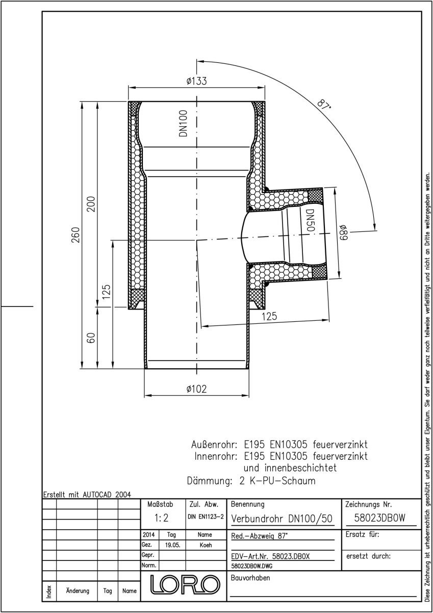 LORO-X Verbundrohr-Red.-Abzweig, bestehend aus Innenrohr (LORO-X Rohr, aus Stahl, feuerverzinkt, nach DIN EN 1123, mit erhöhtem Qualitätsstandard gemäß RAL-Gütezeichen GZ-694, mit 2-Kammern-Steckmuffenverbindung, Baustoffklasse A1, formstabil, bruchfest, rückstausicher, langlebige Innenbeschichtung gemäß DIN EN ISO 2178 auf Basis einer 2K-Epoxid-Kombination, Farbton: Rotbraun), Dämmschicht (PU-Hartschaum B2, FCKW-frei) und Außenrohr (LORO-X Rohr, feuerverzinkt), 87 Grad, DN 100/50