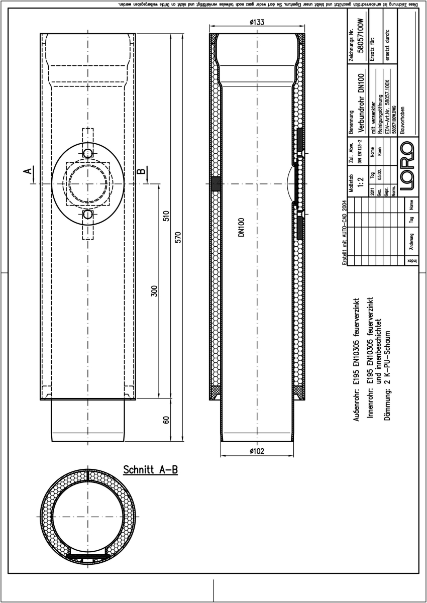 LORO-X Verbundrohr mit Reinigungsöffnung (versenkt), bestehend aus Innenrohr (LORO-X Rohr, aus Stahl, feuerverzinkt, nach DIN EN 1123, mit erhöhtem Qualitätsstandard gemäß RAL-Gütezeichen GZ-694, mit 2-Kammern-Steckmuffenverbindung, Baustoffklasse A1, formstabil, bruchfest, rückstausicher, langlebige Innenbeschichtung gemäß DIN EN ISO 2178 auf Basis einer 2K-Epoxid-Kombination, Farbton: Rotbraun), Dämmschicht (PU-Hartschaum B2, FCKW-frei) und Außenrohr (LORO-X Rohr, feuerverzinkt), 500mm, DN 100