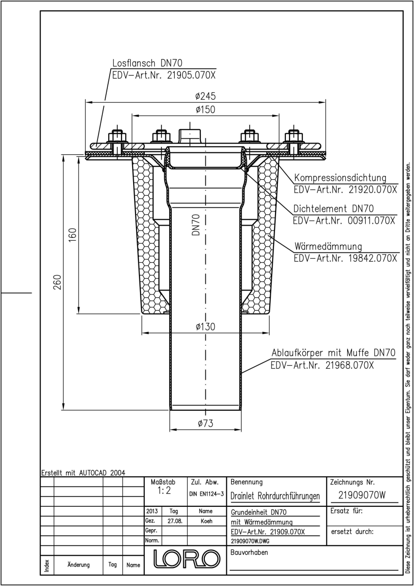 LORO-DRAINLET Regenwasserablauf-Grundeinheit für Verkehrsflächen, mit Klemmflansch, nach DIN EN 1253 mit erhöhtem Qualitätsstandard gemäß RAL-Gütezeichen, asu Edelstahl, bestehend aus Ablaufkörper mit Wärmedämmung, Losflansch, Dichtelement, DN 70