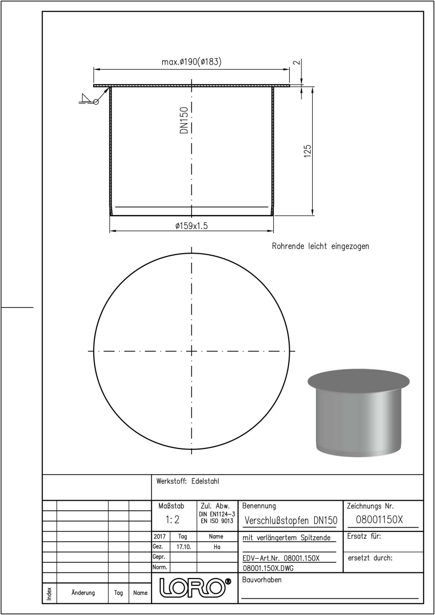 LORO-X Verschlussstopfen mit verlängertem Spitzende, aus Edelstahl, für druckbeaufschlagte Leitungen, nach DIN EN 1124 mit erhöhtem Qualitätsstandard gemäß RAL-Gütezeichen GZ-694, Baustoffklasse A1, formstabil, bruchfest, rückstausicher, DN 150