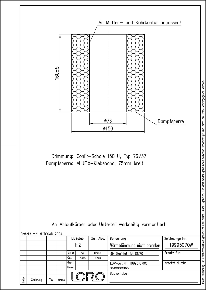 LORO-Wärmedämmung nicht brennbar, für LORO-DRAINJET/DRAINLET Flachdachabläufe, werkseitig vormontiert ,aus Mineralwolle A1, alukaschiert, DN 70