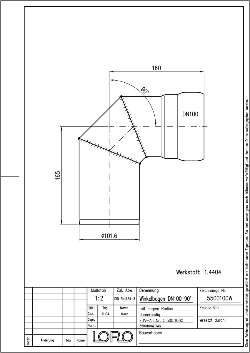 LORO-XCL Winkelbogen, aus Edelstahl, Werkstoff Nr. 1.4404, gebeizt und passiviert, nach DIN EN 1124 mit erhöhtem Qualitätsstandard gemäß RAL-Gütezeichen GZ-694, mit 2-Kammern-Steckmuffenverbindung, Baustoffklasse A1, formstabil, bruchfest, rückstausicher, 90 Grad, DN 100