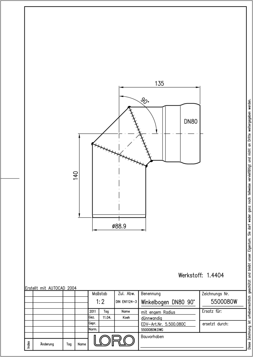 LORO-XCL Winkelbogen, aus Edelstahl, Werkstoff Nr. 1.4404, gebeizt und passiviert, nach DIN EN 1124 mit erhöhtem Qualitätsstandard gemäß RAL-Gütezeichen GZ-694, mit 2-Kammern-Steckmuffenverbindung, Baustoffklasse A1, formstabil, bruchfest, rückstausicher, 90 Grad, DN 80