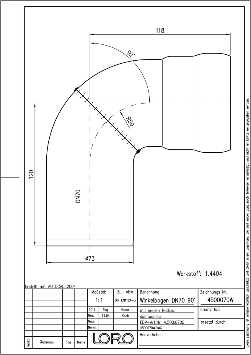 LORO-XCL Winklbogen, aus Edelstahl, Werkstoff Nr. 1.4301, gebeizt und passiviert, nach DIN EN 1124 mit erhöhtem Qualitätsstandard gemäß RAL-Gütezeichen GZ-694, mit 2-Kammern-Steckmuffenverbindung, Baustoffklasse A1, formstabil, bruchfest, rückstausicher, 90 Grad, DN 70