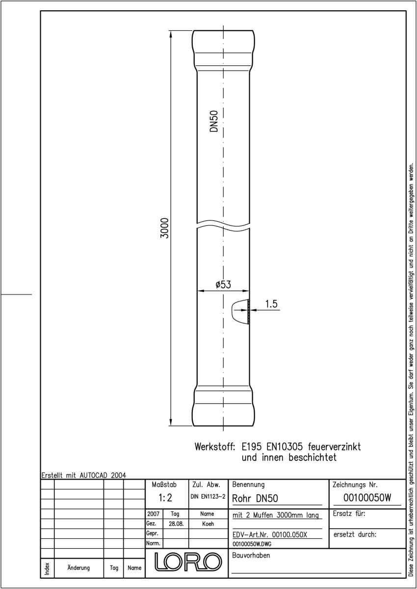 LORO-X Rohr, aus Stahl, feuerverzinkt, nach DIN EN 1123, mit erhöhtem Qualitätsstandard gemäß RAL-Gütezeichen GZ-694, mit 2-Kammern-Steckmuffenverbindung, Baustoffklasse A1, formstabil, bruchfest, rückstausicher, langlebige Innenbeschichtung gemäß DIN EN ISO 2178 auf Basis einer 2K-Epoxid-Kombination, Farbton: Rotbraun, 3000 mm mit 2 Muffen, DN 50