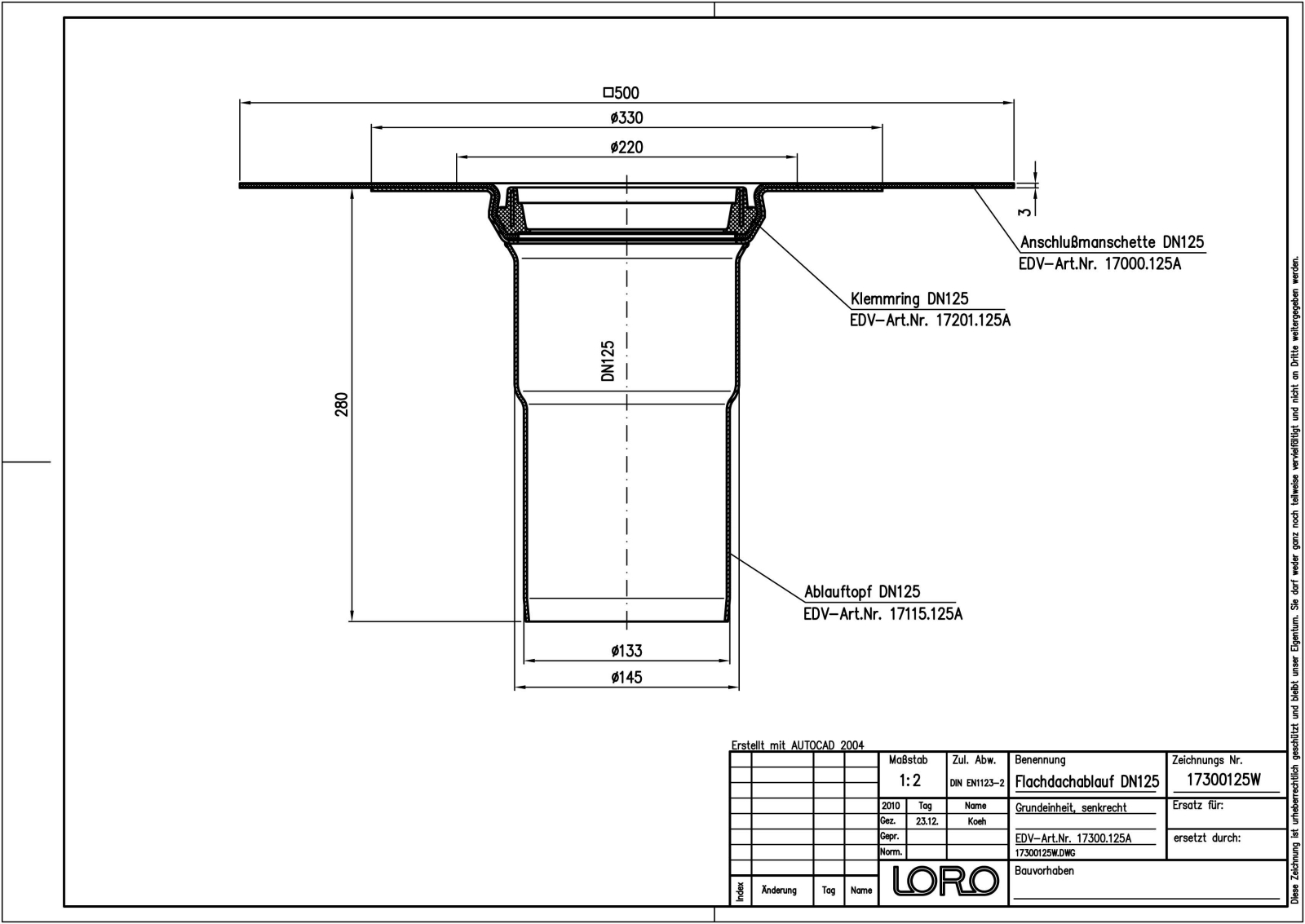 LORO-Flachdachablauf-Grundeinheit, Serie O, nach DIN EN 1253 mit erhöhtem Qualitätsstandard gemäß RAL-Gütezeichen, aus Aluminium, lichtgrau beschichtet, mit Anschlussmanschette aus Bitumen/EPDM-Verbund, einbaufertig, bestehend aus Ablauftrichter, Anschlussmanschette und Klemmring, Auslauf senkrecht, ohne Wärmedämmung DN 125