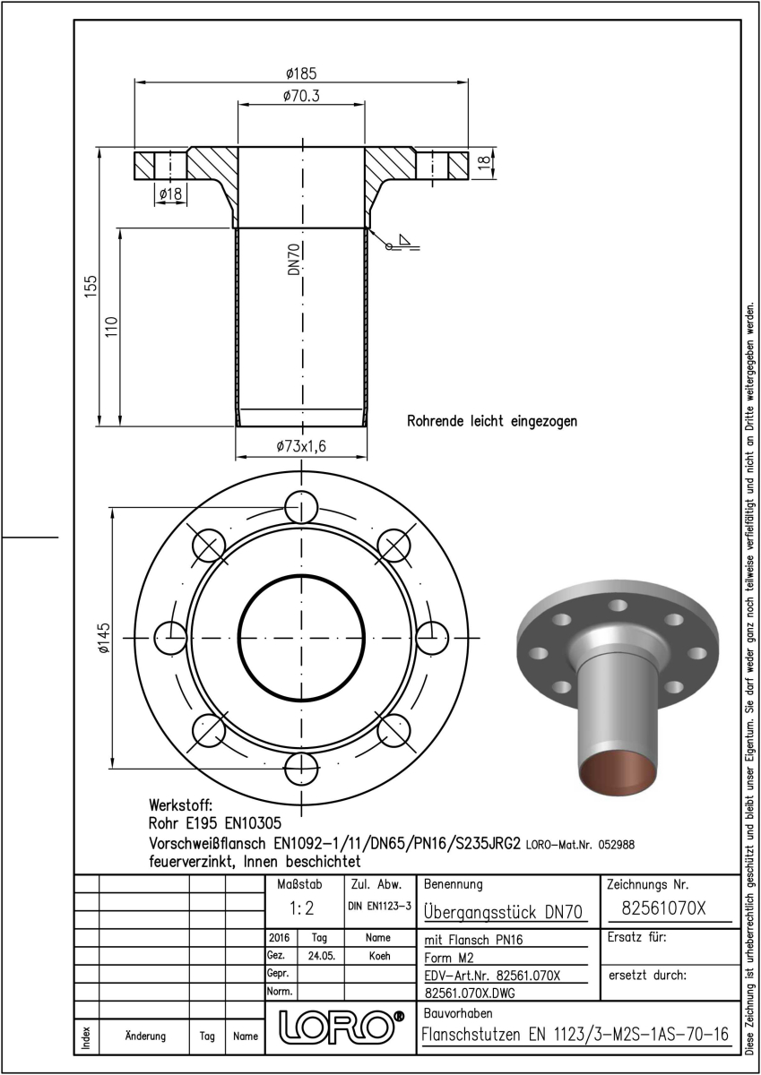 nach DIN EN 1123 aus Stahl feuerverzinkt langlebige Innenbeschichtung gemäß DIN EN ISO 2178 auf Basis einer 2K-Epoxid-Kombination Farbton: Rotbraun DN 70