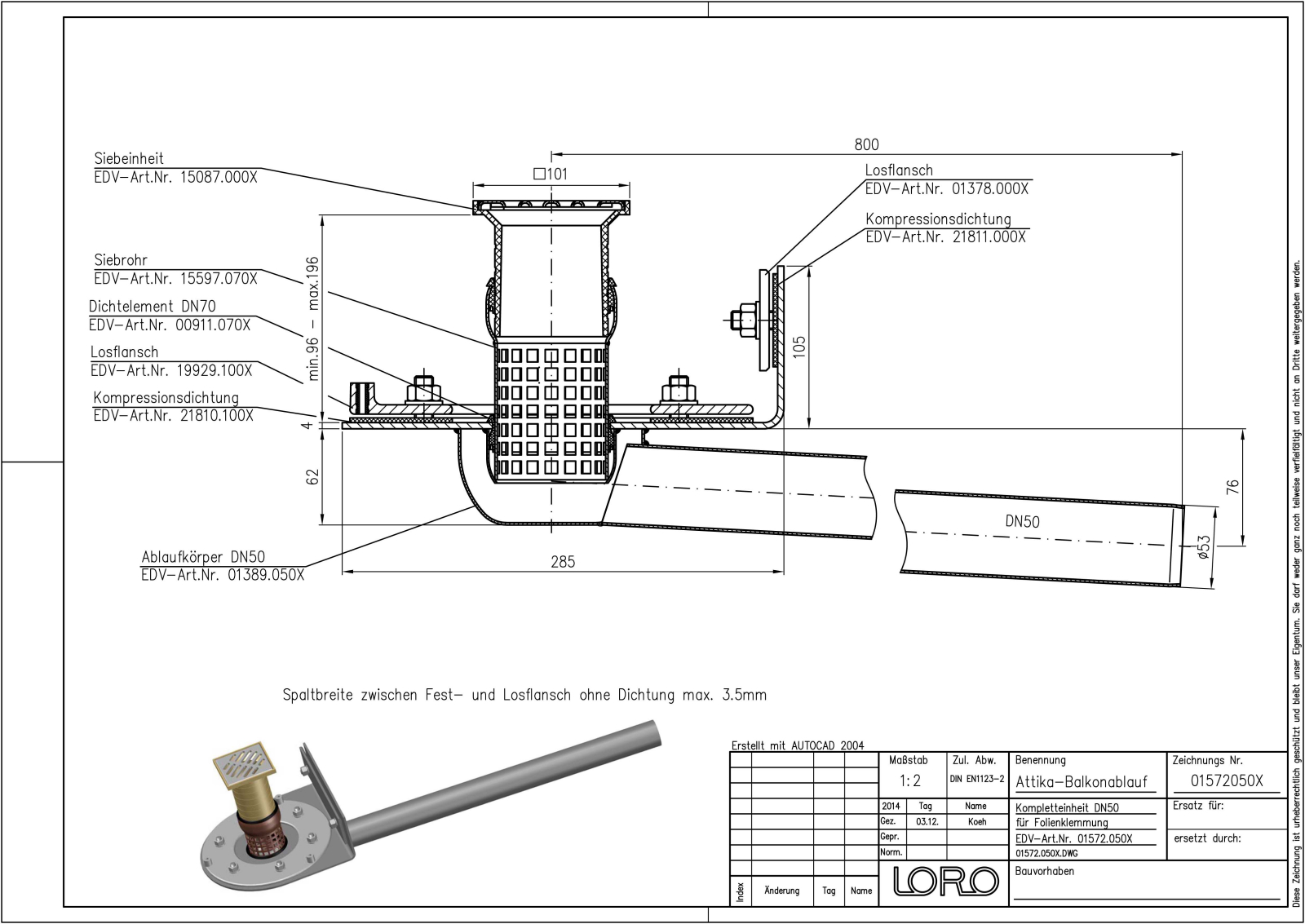 LORO-X Attika-Balkonablauf, mit Klemmflansch, als Los- und Festflanschkonstruktion, 90 Grad Aufkantung für Kunststoff-Abdichtungsbahnen, nach DIN EN 1253, mit erhöhtem Qualitätsstandard gemäß RAL-Gütezeichen GZ-694, aus Edelstahl, bestehend aus Ablauftopf mit Fest-und Losflansch, Siebrohr, Dichtelemente,Siebaufnahme, Edelstahlsieb, DN 50