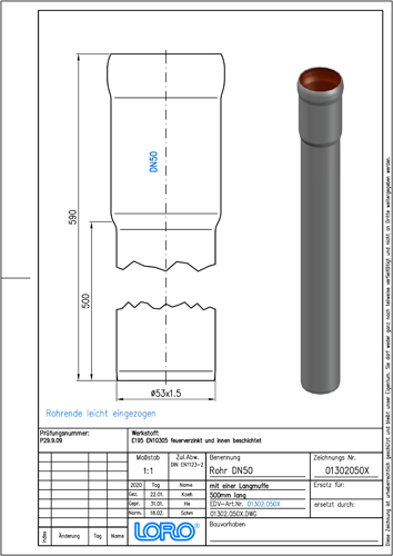 LORO-X Rohr, aus Stahl, feuerverzinkt, nach DIN EN 1123 mit erhöhtem Qualitätsstandard gemäß RAL-Gütezeichen GZ-694, mit Langmuffe, mit speziellem Maß für LORO-X Haupt-Not-Kombi Dachentwässerungssysteme, Länge 500 mm plus Langmuffe, DN 50