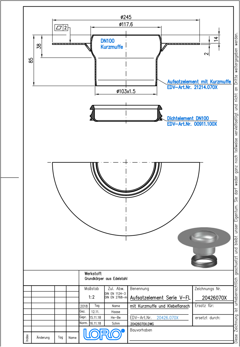 LORO-X Balkonablauf Aufsatzelement für zweiteilige Ausführung, Serie V-FL, mit Klebeflansch, für Abdichtung aus Flüssikgkunststoffen, nach DIN EN 1253, mit erhöhtem Qulitätsstandard gemäß RAL-Gütezeichen GZ-694, bestehend aus: Aufsatzelement mit Muffe und Klebeflansch und Dichtelement DN 100, aus Edelstahl, DN 70