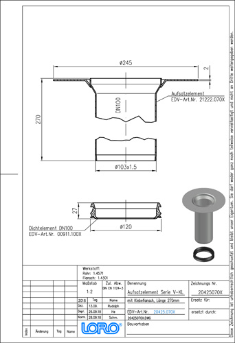 LORO-X Balkonablauf Etageneinsatzeinheit für zweiteilige Ausführung, Serie V-FL, mit Klebeflansch, für Abdichtung aus Flüssigkunststoffen, nach DIN EN 1253, mit erhöhtem Qulitätsstandard gemäß RAL-Gütezeichen GZ-694, bestehend aus: Etageneinsatz mit Klebeflansch und Dichtelement DN 100, aus Edelstahl, DN 70