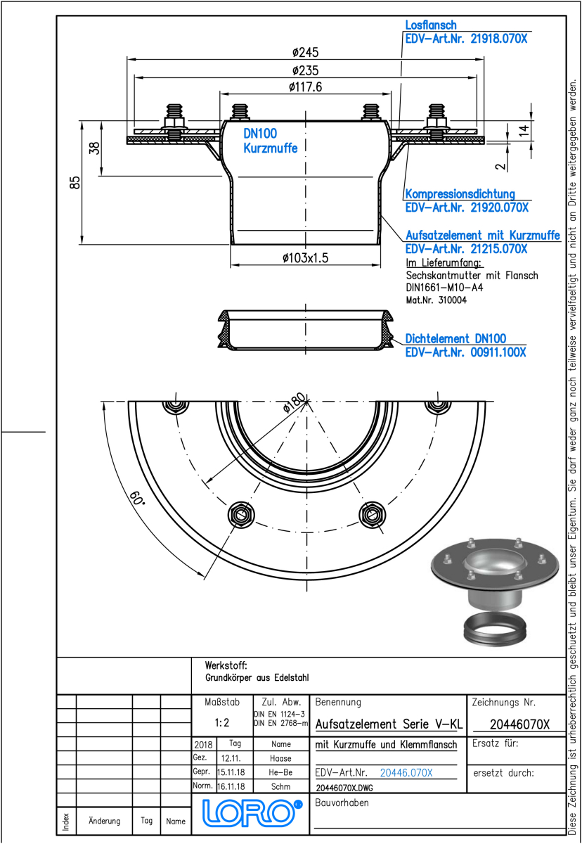 LORO-X Balkonablauf Aufsatzelement für zweiteilige Ausführung, Serie V-KL, mit Klemmflansch, für Abdichtung mit Abdichtungsbahnen, nach DIN EN 1253, mit erhöhtem Qulitätsstandard gemäß RAL-Gütezeichen GZ-694, bestehend aus: Aufsatzelement mit Muffe und Klemmflansch und Dichtelement DN 100, aus Edelstahl, DN 70