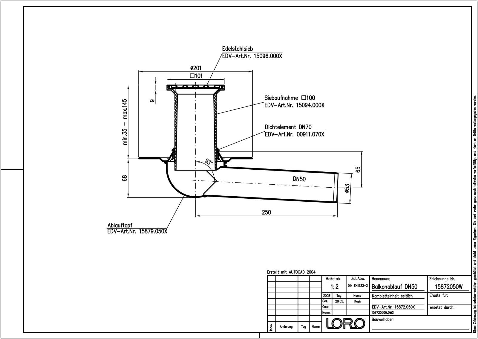 LORO-X Balkonablauf, Serie B mit Stützrand, einteilig ohne Wärmedämmung, Auslauf seitlich 3 Grad, nach DIN EN 1253 mit erhöhtem Qualitätsstandard gemäß RAL-Gütezeichen GZ-694, aus Stahl feuerverzinkt, mit langlebiger Beschichtung gemäß DIN EN ISO 2178 auf Basis einer 2K-Epoxid-Kombination, Farbton: Rotbraun, bestehend aus: bestehend aus Ablauftopf (Stützrandbreite 35 mm umlaufend), Dichtelement, Siebaufnahme 100 x 100 mm (für Aufbauhöhe 35 - 140 mm), Edelstahlsieb, DN 50