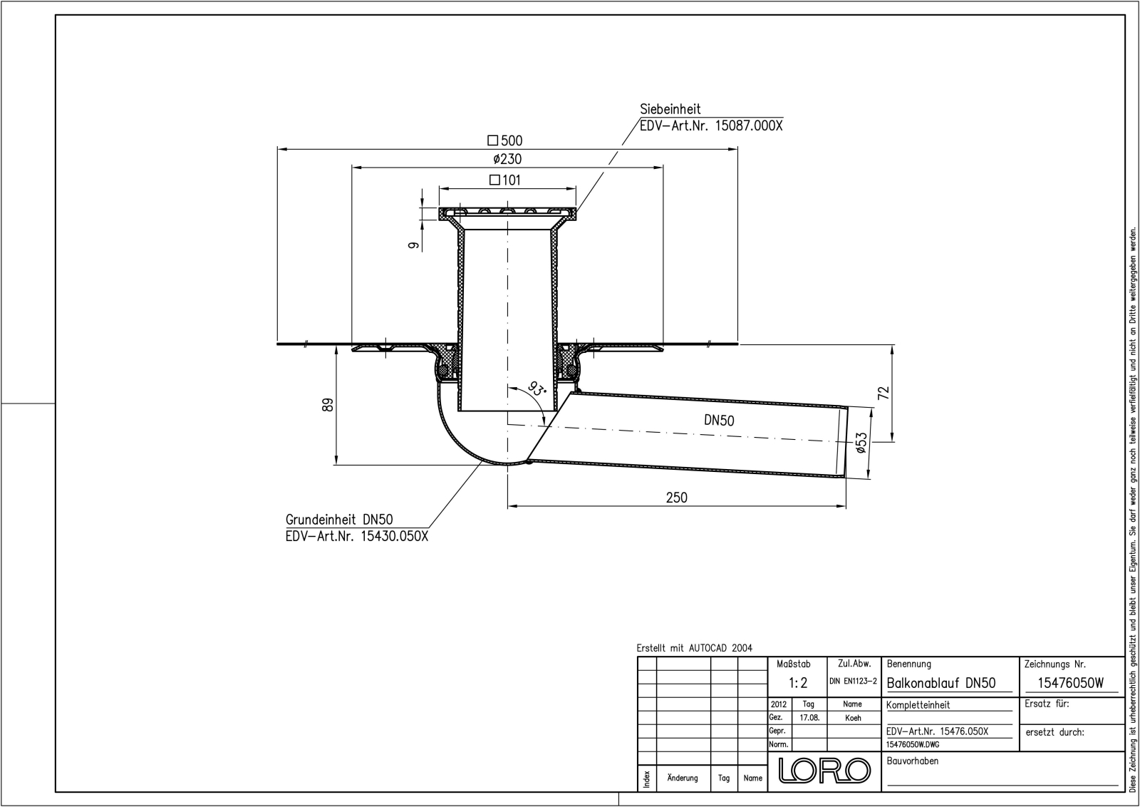 LORO-X Balkonablauf, Serie FF, einteilig ohne Wärmedämmung, Auslauf seitlich 3 Grad, mit vormontierter VS-Anschlussmanschette aus Mehrlagen-Verbundwerkstoff, für Abdichtung mit Flüssigkunststoffen/Verbundabdichtungen, nach DIN EN 1253 mit erhöhtem Qualitätsstandard gemäß RAL-Gütezeichen GZ-694, aus Stahl feuerverzinkt, mit langlebiger Beschichtung gemäß DIN EN ISO 2178 auf Basis einer 2K-Epoxid-Kombination, Farbton: Rotbraun, bestehend aus Ablauftopf, VS-Anschlussmanschette, Dichtelement, Siebaufnahme 100 x 100 mm (für Aufbauhöhe 15 - 130 mm), Edelstahlsieb, DN 50