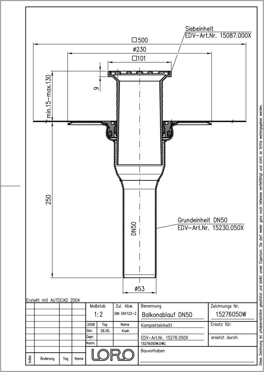 LORO-X Balkonablauf, Serie FF, einteilig ohne Wärmedämmung, Auslauf senkrecht, mit vormontierter VS-Anschlussmanschette aus Mehrlagen-Verbundwerkstoff, für Abdichtung mit Flüssigkunststoffen/Verbundabdichtungen, nach DIN EN 1253 mit erhöhtem Qualitätsstandard gemäß RAL-Gütezeichen GZ-694, aus Stahl feuerverzinkt, mit langlebiger Beschichtung gemäß DIN EN ISO 2178 auf Basis einer 2K-Epoxid-Kombination, Farbton: Rotbraun, bestehend aus Ablauftopf, VS-Anschlussmanschette, Dichtelement, Siebaufnahme 100 x 100 mm (für Aufbauhöhe 15 - 130 mm), Edelstahlsieb, DN 50