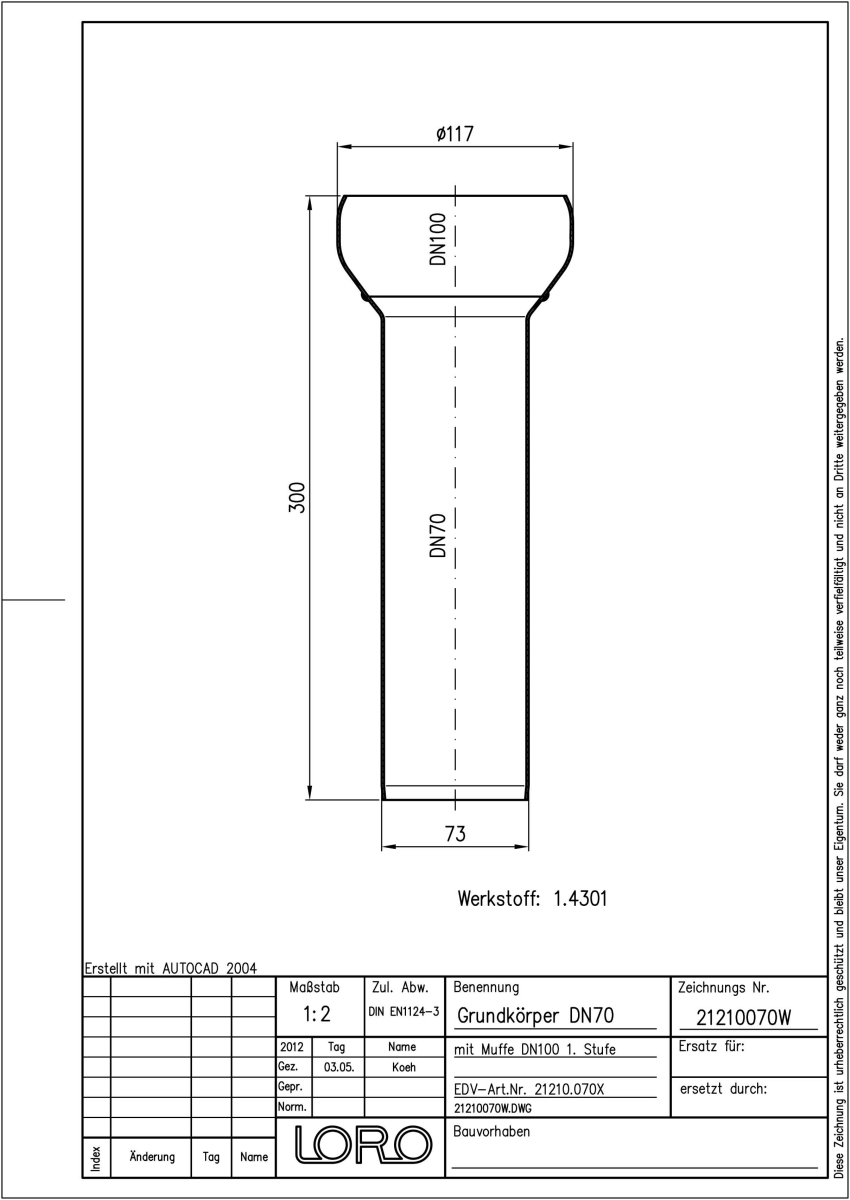 LORO-X Balkonablauf Grundkörper, Serie V, einteilig ohne Wäremdämmung, Auslauf senkrecht, nach DIN EN 1253, mit erhöhtem Qualitätsstandard gemäß RAL-Gütezeichen GZ-694, aus Edelstahl, DN 70.