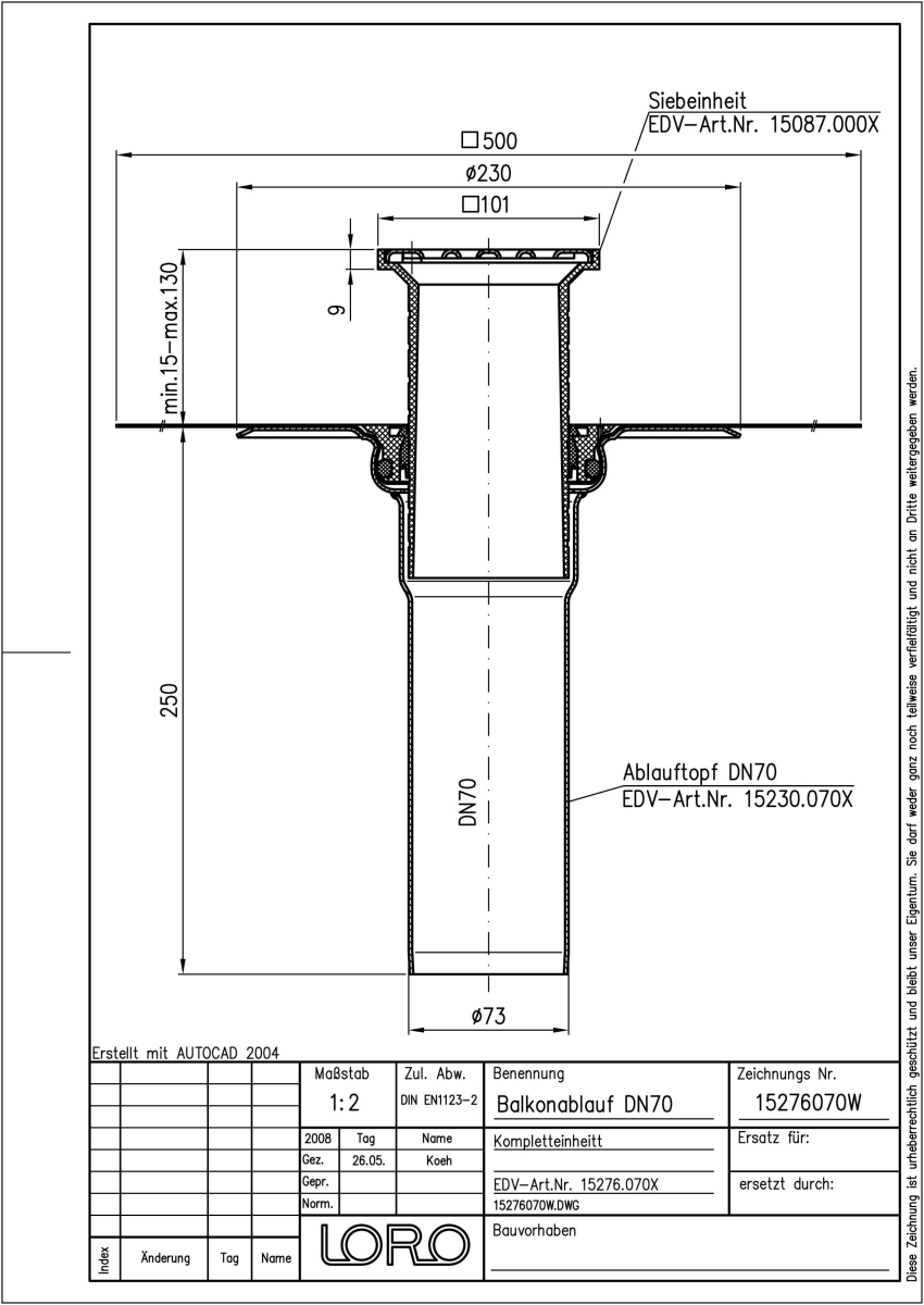 LORO-X Balkonablauf, Serie FF, einteilig ohne Wärmedämmung, Auslauf senkrecht, mit vormontierter VS-Anschlussmanschette aus Mehrlagen-Verbundwerkstoff, für Abdichtung mit Flüssigkunststoffen/Verbundabdichtungen, nach DIN EN 1253 mit erhöhtem Qualitätsstandard gemäß RAL-Gütezeichen GZ-694, aus Stahl feuerverzinkt, mit langlebiger Beschichtung gemäß DIN EN ISO 2178 auf Basis einer 2K-Epoxid-Kombination, Farbton: Rotbraun, bestehend aus Ablauftopf, VS-Anschlussmanschette, Dichtelement, Siebaufnahme 100 x 100 mm (für Aufbauhöhe 15 - 130 mm), Edelstahlsieb, DN 70