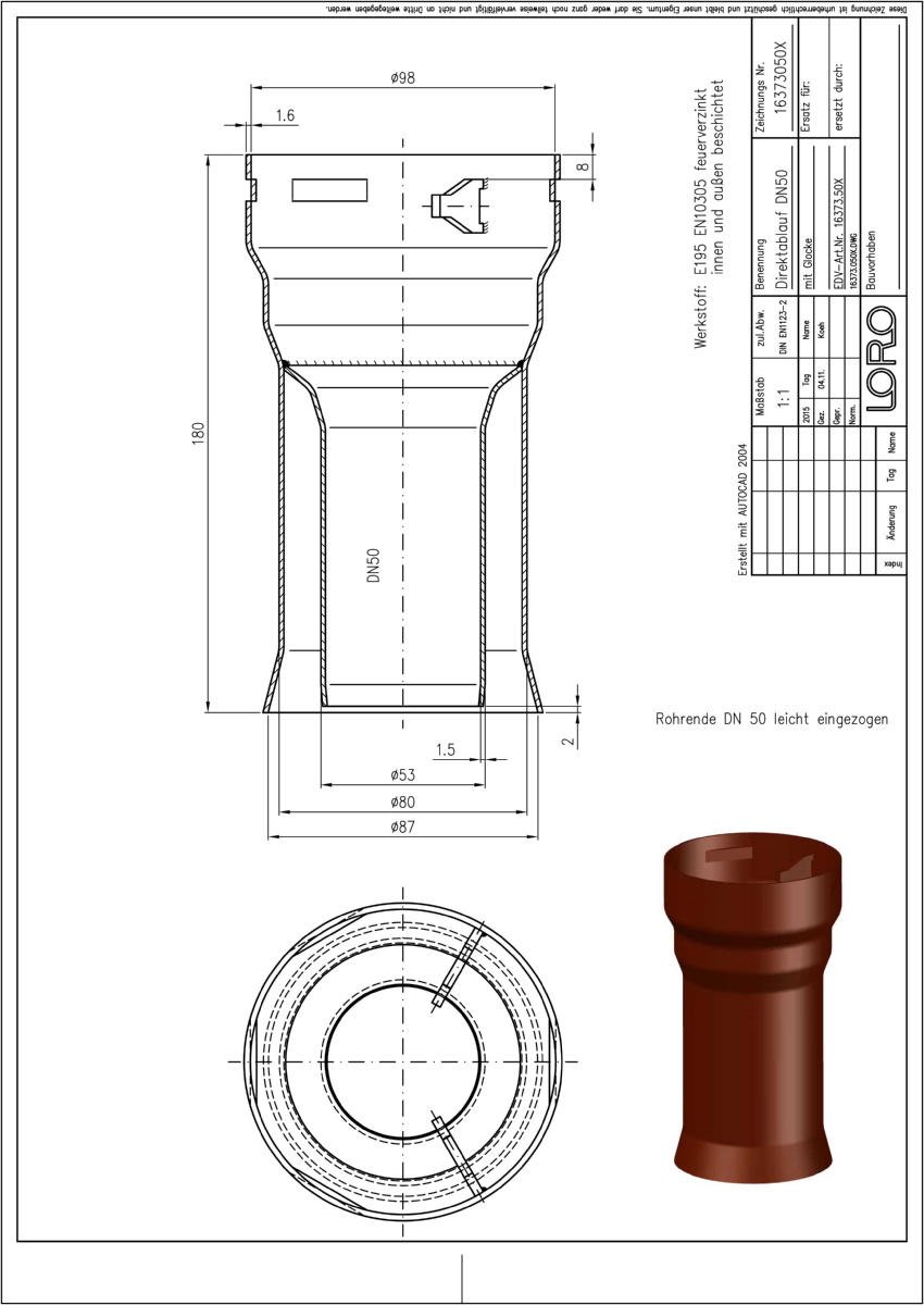 LORO-X Balkondirektablauf, Serie I mit Glocke, Auslauf senkrecht, nach DIN EN 1253 mit erhöhtem Qualitätsstandard gemäß RAL-Gütezeichen GZ-694, aus Stahl feuerverzinkt, mit langlebiger Beschichtung gemäß DIN EN ISO 2178 auf Basis einer 2K-Epoxid-Kombination, Farbton: Rotbraun, für Plattenstärke 180 mm, ohne Sieb, DN 50