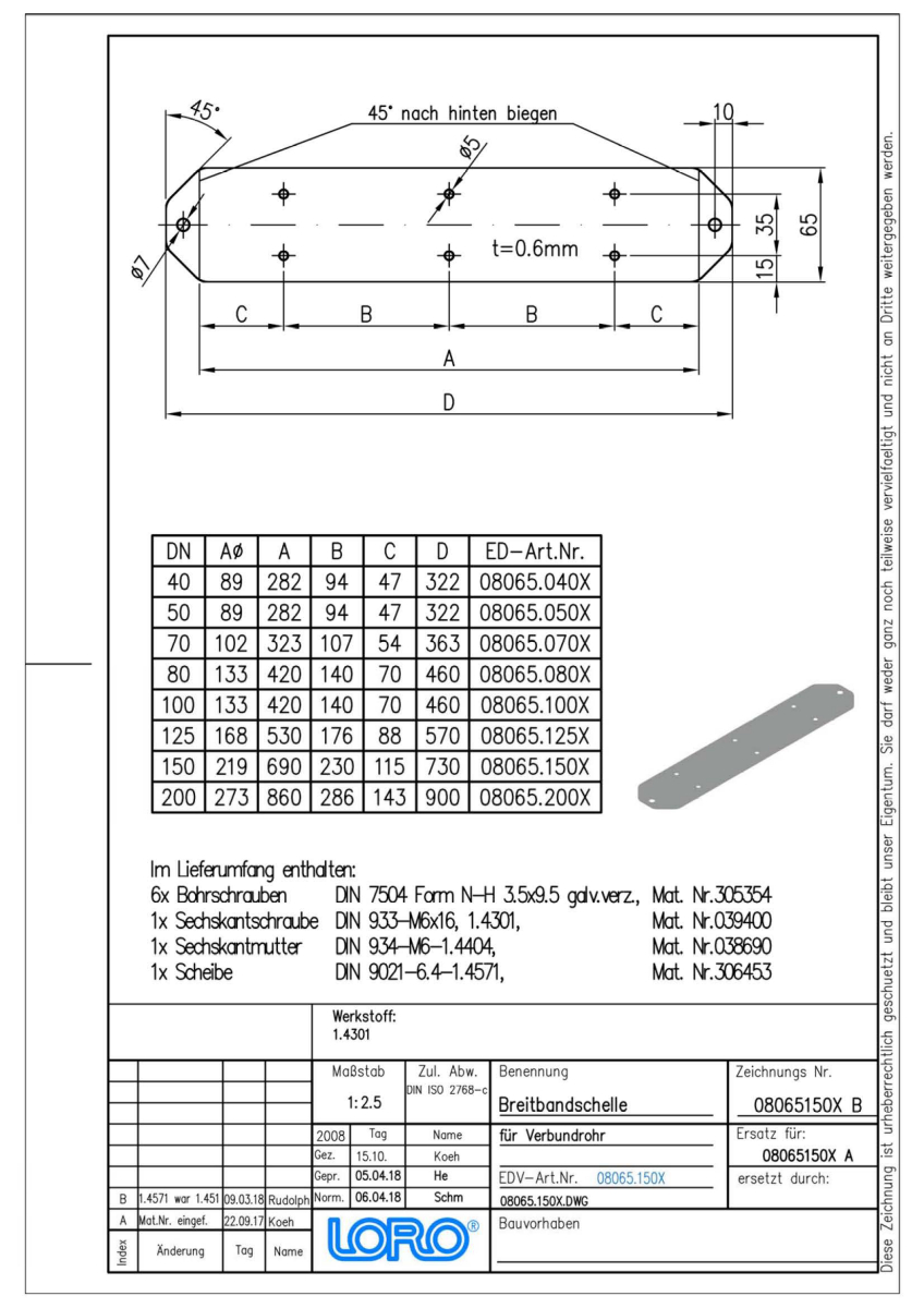 LORO-X Breitbandschelle, zur axialen Schubsicherung bei druckbeaufschlagten LORO-X Verbundrohren, aus Edelstahl, Werkstoff Nr. 1.4301, DN 150