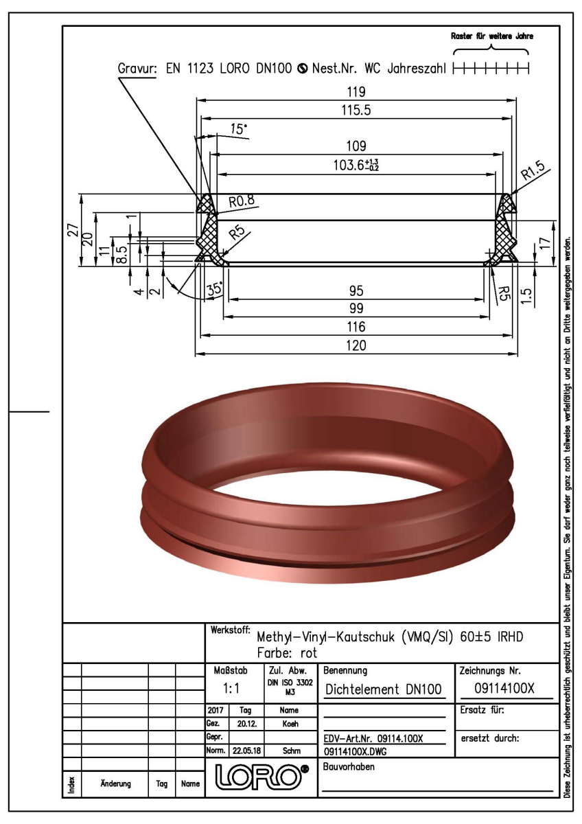 LORO-X Dichtelement aus Methyl-Vinyl-Kautschuk (VMQ), Farbton: rot, DN 100