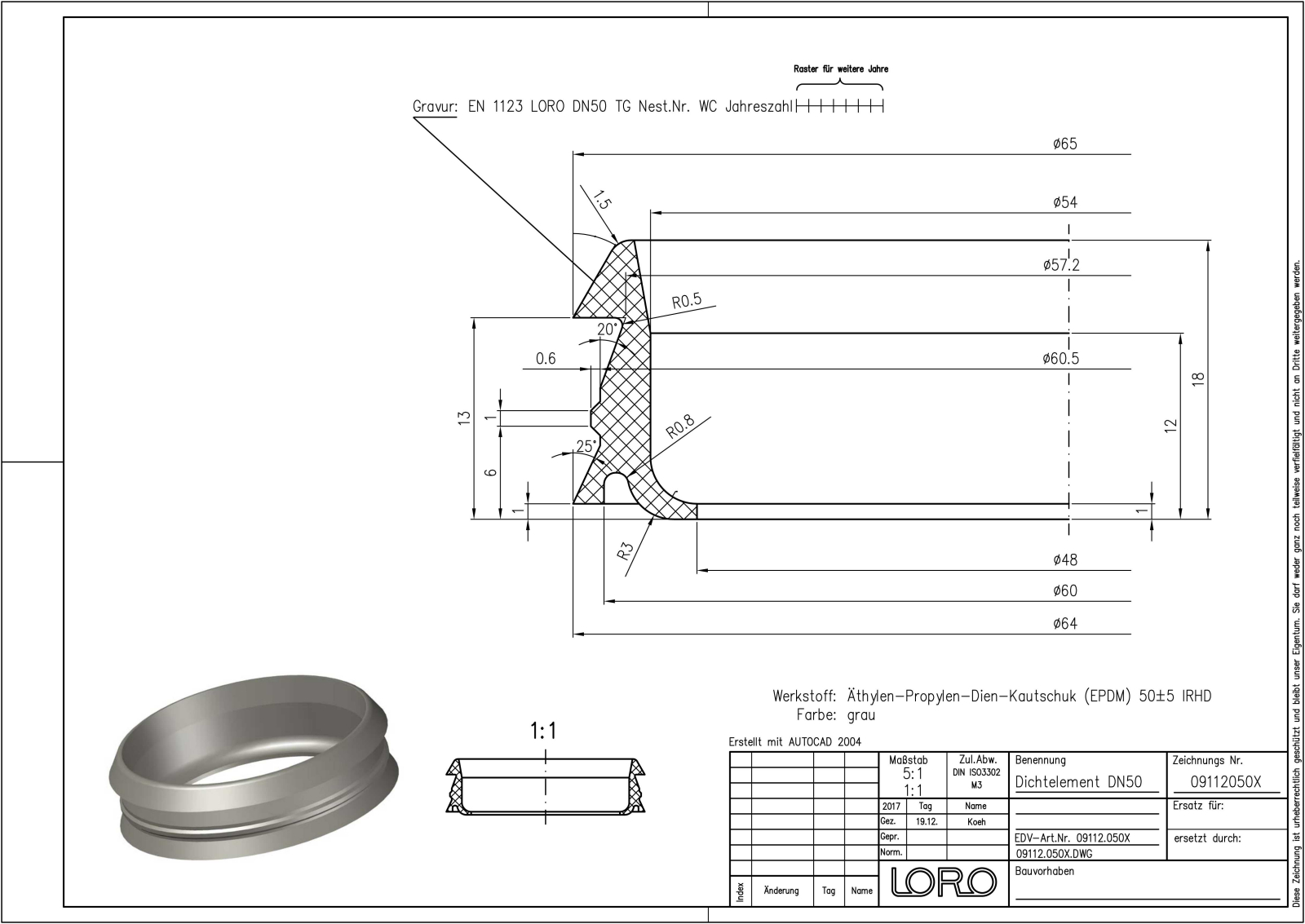 LORO-X Dichtelement aus Äthylen-Propylen-Kautschuk (EPDM), Farbton: grau, DN 50