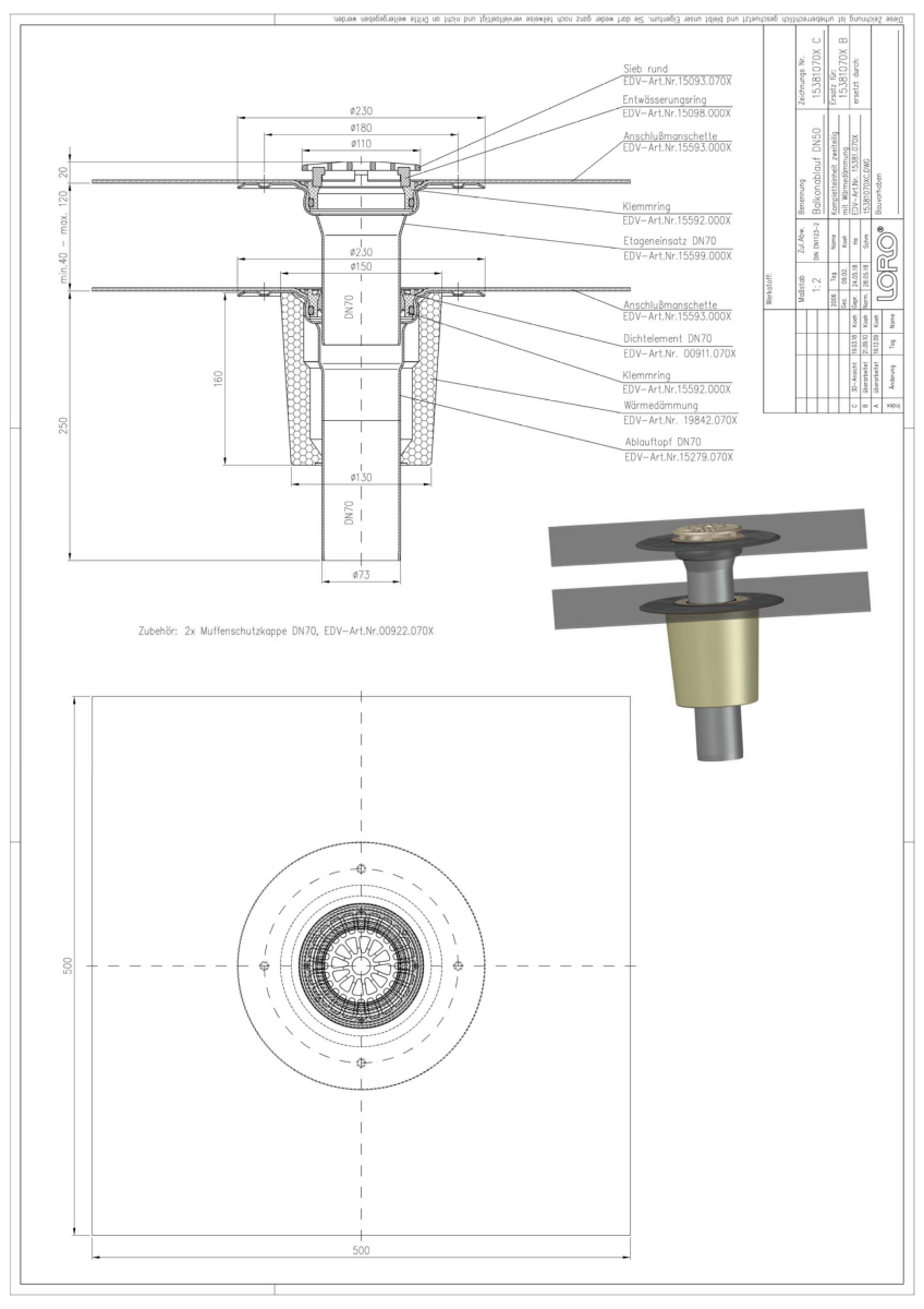 LORO-X Balkonablauf, Serie E, zweiteilig mit Wärmedämmung, Auslauf senkrecht, mit vormontierter Anschlussmanschette aus Bitumen EPDM Verbund, nach DIN EN 1253 mit erhöhtem Qualitätsstandard gemäß RAL-Gütezeichen GZ-694, aus Stahl feuerverzinkt, mit langlebiger Beschichtung gemäß DIN EN ISO 2178 auf Basis einer 2K-Epoxid-Kombination, Farbton: Rotbraun, bestehend aus Ablauftopf, Anschlussmanschette, Klemmring, Dichtelement, Etageneinsatz (für Aufbauhöhe 40 - 120 mm), Anschlussmanschette, Klemmring, Entwässerungsring, Sieb rund, DN 70