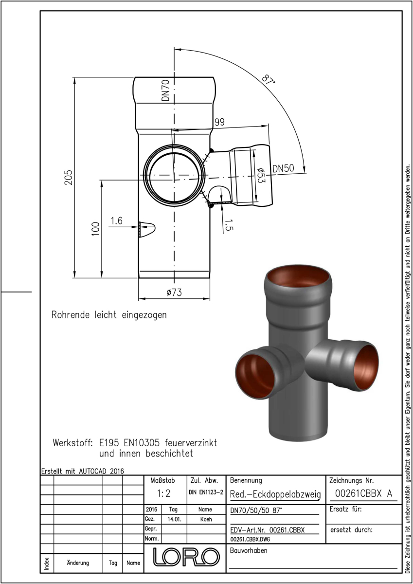 LORO-X Red.-Eckdoppelabzweig, aus Stahl, feuerverzinkt, nach DIN EN 1123 mit erhöhtem Qualitätsstandard gemäß RAL-Gütezeichen GZ-694, mit 2-Kammern-Steckmuffenverbindung, Baustoffklasse A1, formstabil, bruchfest, rückstausicher, langlebige Innenbeschichtung gemäß DIN EN ISO 2178 auf Basis einer 2K-Epoxid-Kombination, Farbton: Rotbraun, 87 Grad, DN 70/50/50