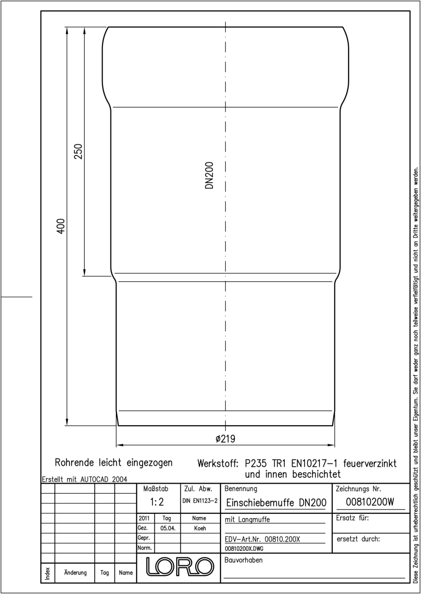 LORO-X Einschiebmuffe aus Stahl, feuerverzinkt, nach DIN EN 1123 mit erhöhtem Qualitätsstandard gemäß RAL-Gütezeichen GZ-694, mit 2-Kammern-Steckmuffenverbindung, Baustoffklasse A1, formstabil, bruchfest, rückstausicher, langlebige Innenbeschichtung gemäß DIN EN ISO 2178 auf Basis einer 2K-Epoxid-Kombination, Farbton: Rotbraun, DN 200