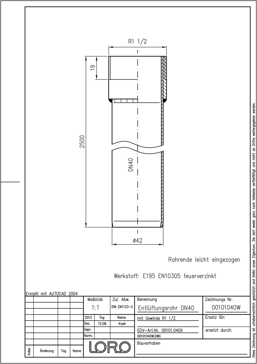 LORO-X Entlüftungsrohr, mit Aussengewinde 2 Zoll, aus Stahl, feuerverzinkt, 2500 mm lang, DN 40