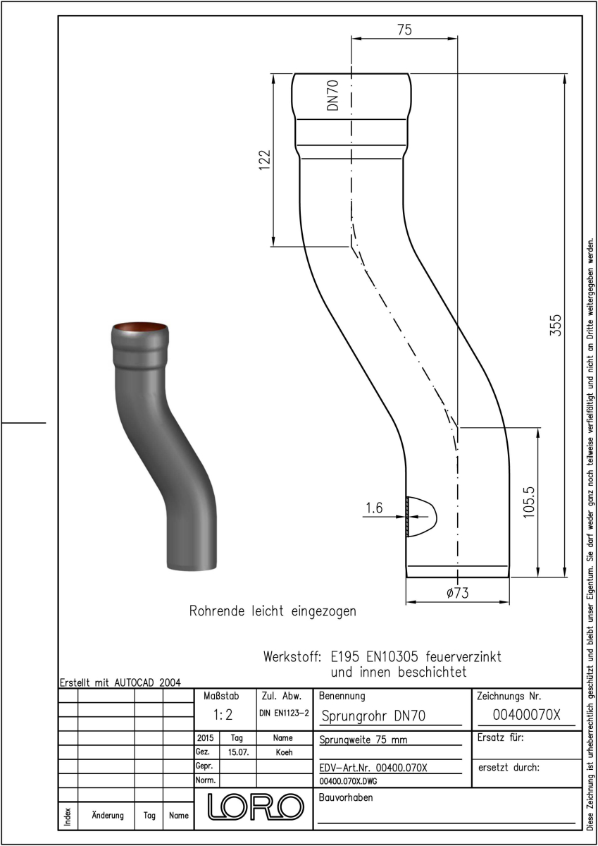 LORO-X Etagenbogen aus Stahl, feuerverzinkt, nach DIN EN 1123, mit erhöhtem Qualitätsstandard gemäß RAL-Gütezeichen GZ-694, mit 2-Kammern-Steckmuffenverbindung, Baustoffklasse A1, formstabil, bruchfest, rückstausicher, langlebige Innenbeschichtung gemäß DIN EN ISO 2178 auf Basis einer 2K-Epoxid-Kombination, Farbton: Rotbraun, Sprung 75 mm, DN 70