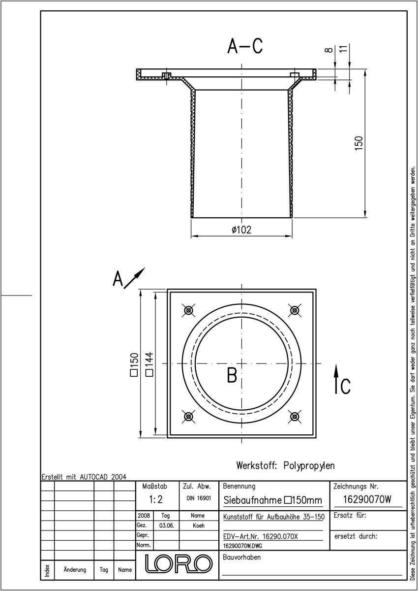 aus Kunststoff 150 x 150 mm. DN 70