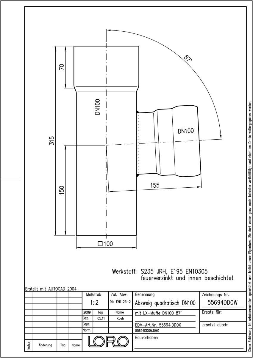 LORO-X Abzweig, aus Stahl, feuerverzinkt, nach DIN EN 1123, mit erhöhtem Qualitätsstandard gemäß RAL-Gütezeichen GZ-694, Baustoffklasse A1, formstabil, bruchfest, quadratisch/rund, langlebige Innenbeschichtung gemäß DIN EN ISO 2178 auf Basis einer 2K-Epoxid-Kombination, Farbton: Rotbraun, 87 Grad, DN 100