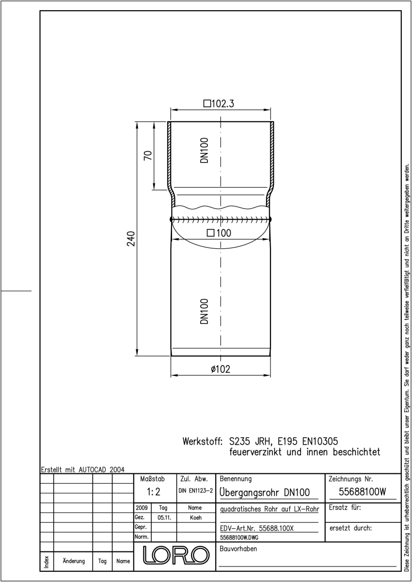 LORO-X Übergangsrohr, aus Stahl, feuerverzinkt, quadratisch auf rund, nach DIN EN 1123, mit erhöhtem Qualitätsstandard gemäß RAL-Gütezeichen GZ-694, Baustoffklasse A1, formstabil, bruchfest, langlebige Innenbeschichtung gemäß DIN EN ISO 2178 auf Basis einer 2K-Epoxid-Kombination, Farbton: Rotbraun, DN 100