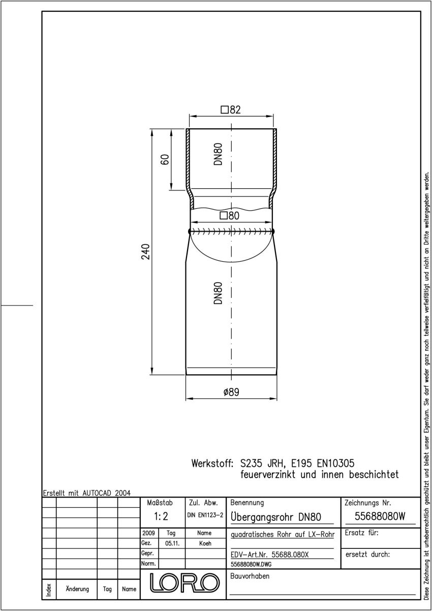 LORO-X Übergangsrohr, aus Stahl, feuerverzinkt, quadratisch auf rund, nach DIN EN 1123, mit erhöhtem Qualitätsstandard gemäß RAL-Gütezeichen GZ-694, Baustoffklasse A1, formstabil, bruchfest, langlebige Innenbeschichtung gemäß DIN EN ISO 2178 auf Basis einer 2K-Epoxid-Kombination, Farbton: Rotbraun, DN 80
