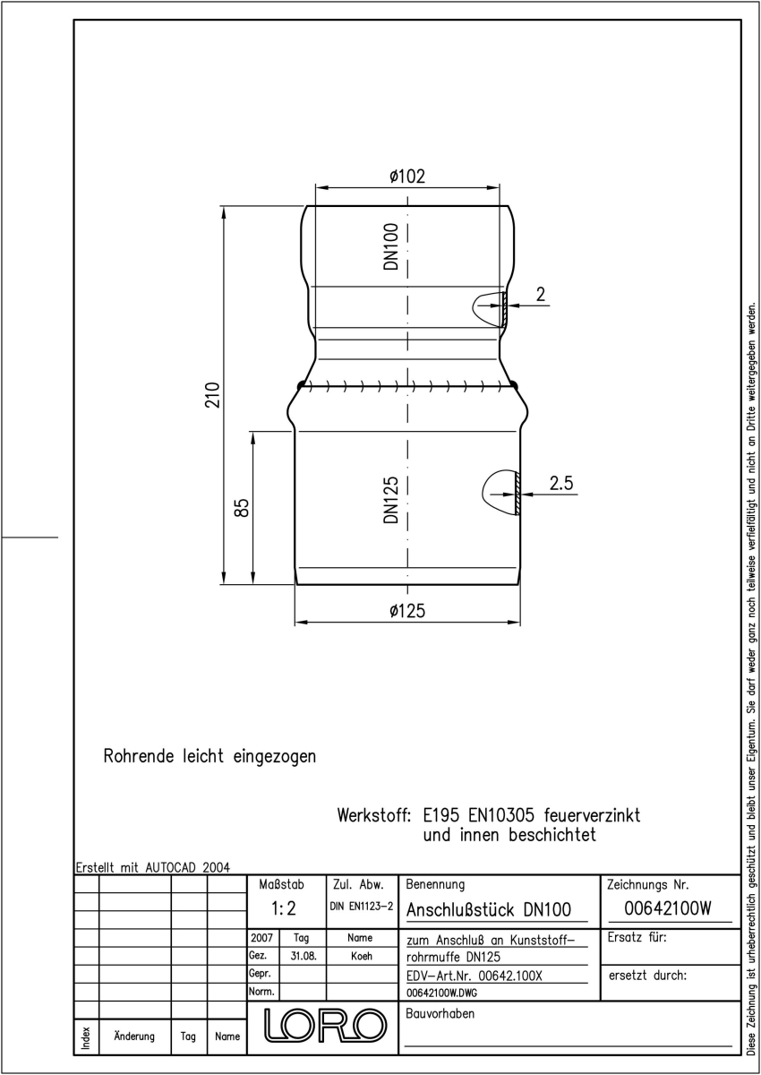 LORO-X Anschlussstück aus Stahl, feuerverzinkt, von LORO-X Rohr DN 100 an Kunststoffrohrmuffe DN 125, nach DIN EN 1123 mit erhöhtem Qualitätsstandard gemäß RAL-Gütezeichen GZ-694, mit 2-Kammern-Steckmuffenverbindung, Baustoffklasse A1, formstabil, bruchfest, rückstausicher, langlebige Innenbeschichtung gemäß DIN EN ISO 2178 auf Basis einer 2K-Epoxid-Kombination, Farbton: Rotbraun, DN 100/125