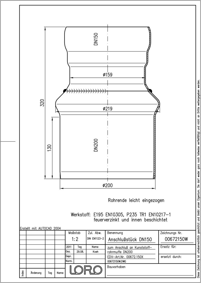 LORO-X Anschlussstück aus Stahl, feuerverzinkt, von LORO-X Rohr an Kunststoffrohrmuffe DN 200, nach DIN EN 1123 mit erhöhtem Qualitätsstandard gemäß RAL-Gütezeichen GZ-694, mit 2-Kammern-Steckmuffenverbindung, Baustoffklasse A1, formstabil, bruchfest, rückstausicher, langlebige Innenbeschichtung gemäß DIN EN ISO 2178 auf Basis einer 2K-Epoxid-Kombination, Farbton: Rotbraun, DN 150/200