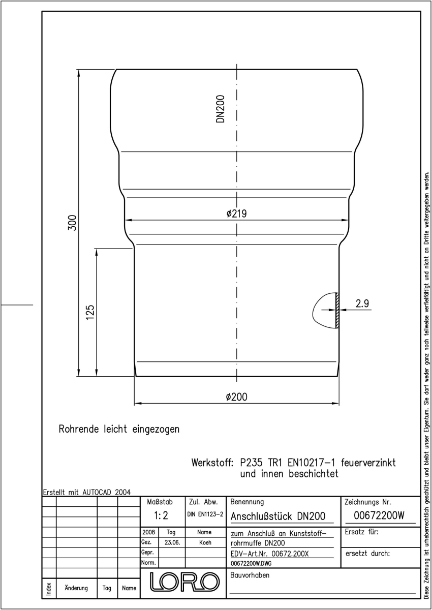 LORO-X Anschlussstück aus Stahl, feuerverzinkt, von LORO-X Rohr DN 200 an Kunststoffrohrmuffe DN 200 nach DIN EN 1123 mit erhöhtem Qualitätsstandard gemäß RAL-Gütezeichen GZ-694, mit 2-Kammern-Steckmuffenverbindung, Baustoffklasse A1, formstabil, bruchfest, rückstausicher, langlebige Innenbeschichtung gemäß DIN EN ISO 2178 auf Basis einer 2K-Epoxid-Kombination, Farbton: Rotbraun, DN 200/200