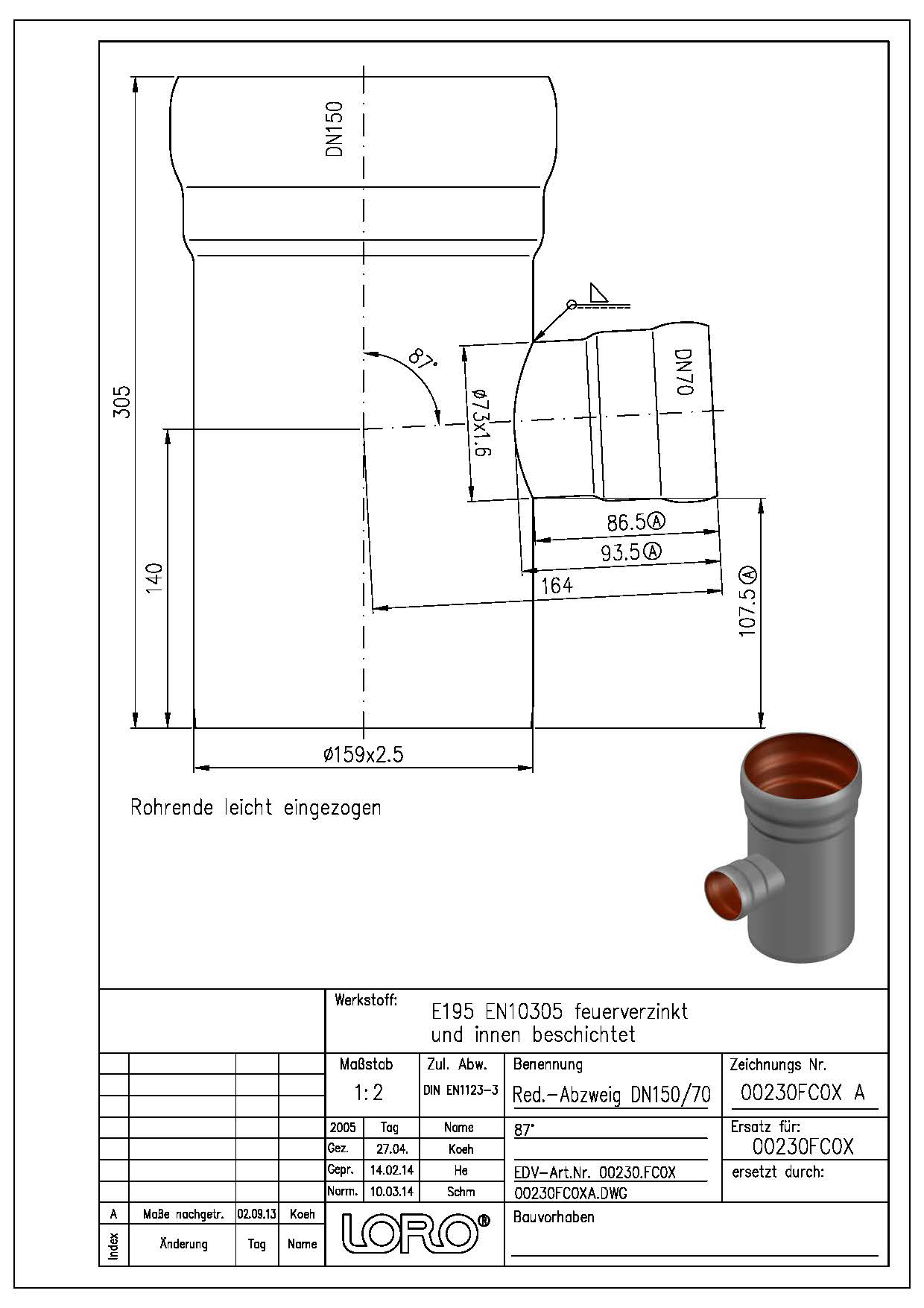 LORO-X Red.-Abzweig, aus Stahl, feuerverzinkt, nach DIN EN 1123, mit erhöhtem Qualitätsstandard gemäß RAL-Gütezeichen GZ-694, mit 2-Kammern-Steckmuffenverbindung, Baustoffklasse A1, formstabil, bruchfest, rückstausicher, langlebige Innenbeschichtung gemäß DIN EN ISO 2178 auf Basis einer 2K-Epoxid-Kombination, Farbton: Rotbraun, 87 Grad, DN 150/70