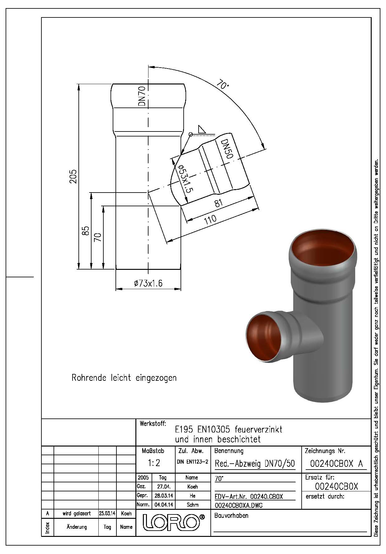 LORO-X Red.-Abzweig, aus Stahl, feuerverzinkt, nach DIN EN 1123, mit erhöhtem Qualitätsstandard gemäß RAL-Gütezeichen GZ-694, mit 2-Kammern-Steckmuffenverbindung, Baustoffklasse A1, formstabil, bruchfest, rückstausicher, langlebige Innenbeschichtung gemäß DIN EN ISO 2178 auf Basis einer 2K-Epoxid-Kombination, Farbton: Rotbraun, 70 Grad, DN 70/50