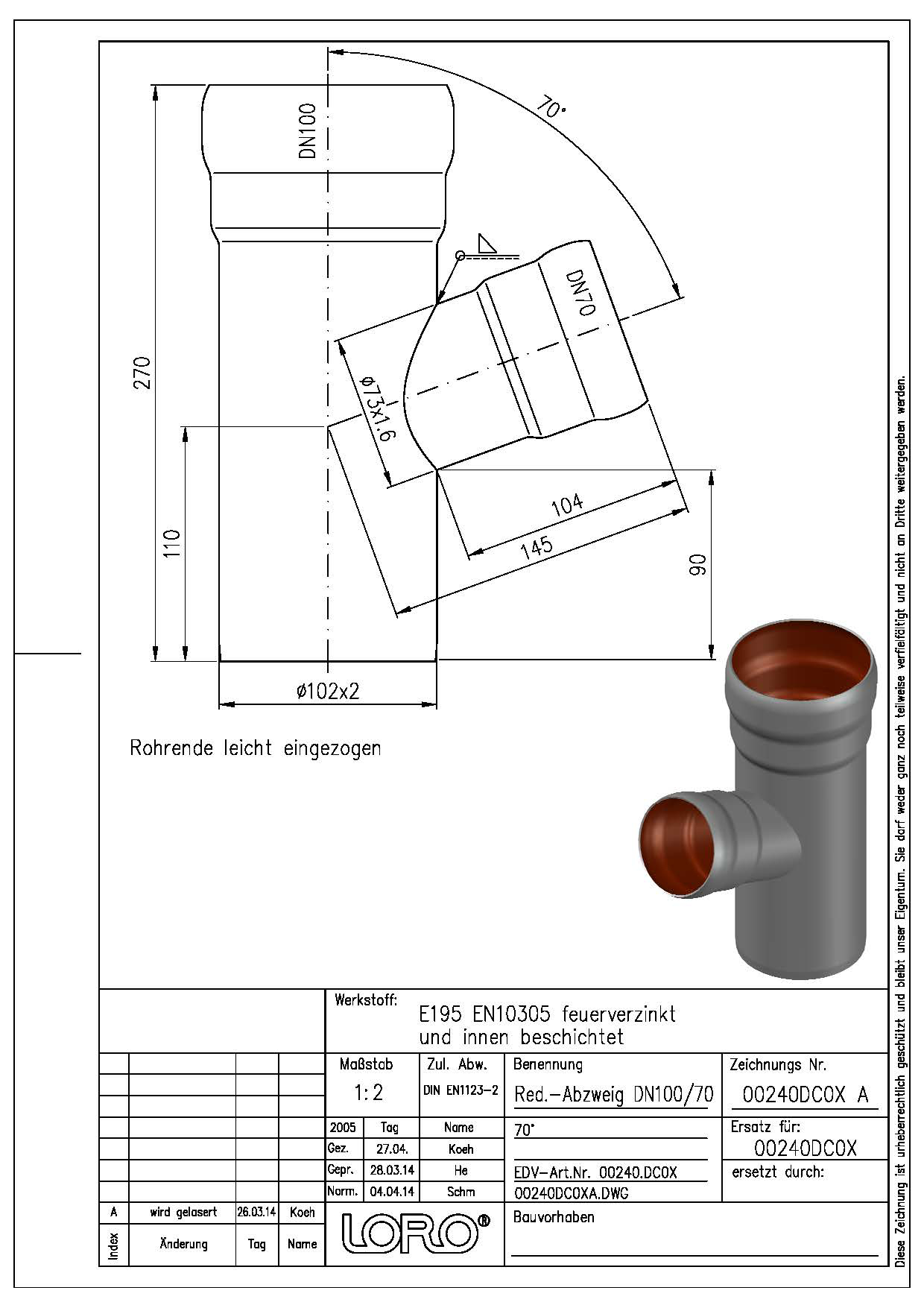 LORO-X Red.-Abzweig, aus Stahl, feuerverzinkt, nach DIN EN 1123, mit erhöhtem Qualitätsstandard gemäß RAL-Gütezeichen GZ-694, mit 2-Kammern-Steckmuffenverbindung, Baustoffklasse A1, formstabil, bruchfest, rückstausicher, langlebige Innenbeschichtung gemäß DIN EN ISO 2178 auf Basis einer 2K-Epoxid-Kombination, Farbton: Rotbraun, 70 Grad, DN 100/70