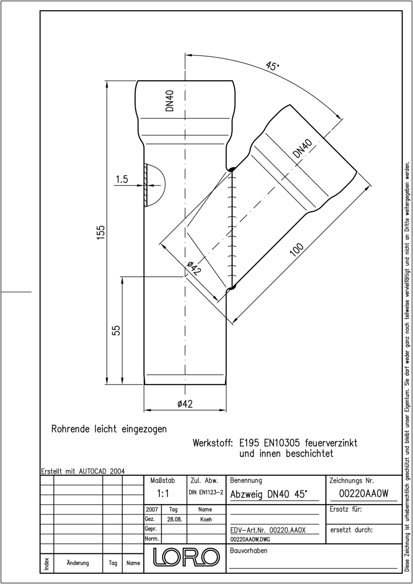 LORO-X Abzweig, aus Stahl, feuerverzinkt, nach DIN EN 1123, mit erhöhtem Qualitätsstandard gemäß RAL-Gütezeichen GZ-694, mit 2-Kammern-Steckmuffenverbindung, Baustoffklasse A1, formstabil, bruchfest, rückstausicher, langlebige Innenbeschichtung gemäß DIN EN ISO 2178 auf Basis einer 2K-Epoxid-Kombination, Farbton: Rotbraun, 45 Grad, DN 40